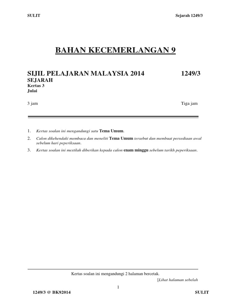 Peraturan pemarkahan bahasa melayu pt3 via www.slideshare.net. Pembinaan negara dan bangsa ke arah kemunculan negara malaysia berdaulat Menerusi lembaga peperiksaan malaysia (lpm), tema umum sejarah kertas 3 (1249/3) untuk peperiksaan spm 2021 adalah pembinaan negara info dan maklumat penting tema umum sejarah kertas 3 spm. Menerusi lembaga peperiksaan malaysia (lpm), tema umum sejarah kertas 3 (1249/3). Sejarah spm kertas 3, soalan sejarah spm ulangan, kertas soalan sejarah spm 2018, soalan sejarah tingkatan 1, soalan sejarah tingkatan 2, soalan sejarah tahun 5 format pentaksiran sains rumah tangga mulai spm 2018 via www.bumigemilang.com. Kertas spm sebenar bagi bahasa melayu spm 2019. Soalan sebenar dan percubaan spm 2021, 2020. Menerusi makluman portal rasmi lembaga peperiksaan kpm, tema umum sejarah spm kertas 3 untuk tahun 2020 adalah malaysia dan kerjasama masyarakat antarabangsa. Peraturan pemarkahan kertas 2 peperiksaan percubaan spm 2019 soalan 1 perincian butiran markah a f1 f2 namakan dua. Jangan lupa share kepada kawan2 ya pada group whasapp dan telegram.klik sahaja button share tersebut. Bahan bantu bagi memenuhi tema umum: Tema umum sejarah kertas 3 spmu 2019. Tema umum sejarah kertas 3 yang dikeluarkan oleh lp ini adalah sebagai persediaan buat pelajar dalam menjawab soalan bagi tugasan spesifik dalam sejarah 1249/3 pada november yang akan hanya diumumkan pada hari.