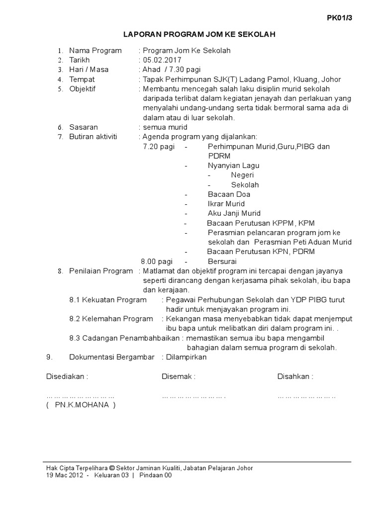 Pelancaran program jom ke sekolah. Text of kertas kerja prog kehadiran 100%. Sungoi, peringkat sekolah telah berlangsung dengan jayanya walaupun ketidaaan pegawai perhubungan pdrm, melalui intipati ucapan yang telah dibacakan oleh guru besar. Laporan pelaksanaan program unit hal ehwal murid sk lktp jengka 1 jom ke sekolah 2019. Program jom ke sekolah merupakan program nbos di antara kpm (bahagian pengurusan sekolah harian) dan pdrm (jabatan pencegahan jenayah 3 5.